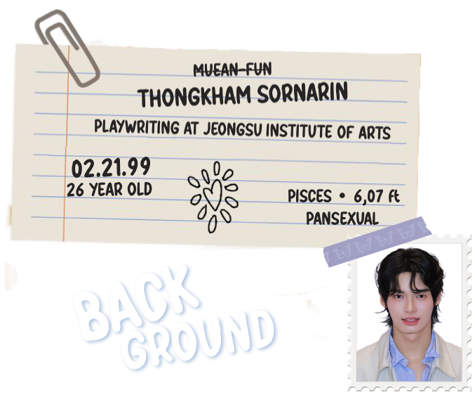 • O Eco de uma Infância PerfeitaNascido em uma redoma de vidro, os primeiros anos de Muean-Fun Thongkham Sornarin foram cercados por luxo e afeto aparente. Ele era o filho do meio, o equilíbrio entre o pragmatismo do irmão mais velho e a energia da irmã caçula. Naquela época, a casa em Bangkok era preenchida por música clássica, o cheiro de açúcar queimado das receitas experimentais de seu pai e as risadas de uma mãe que ainda não tinha sido consumida pela própria imagem. Thongkham ouvia tudo: o farfalhar das folhas no jardim, os segredos sussurrados pelos irmãos e a promessa de um futuro brilhante. Ele era uma criança sensível, que já encontrava beleza nas pequenas rimas que formava mentalmente.• A Queda do SomA vida do garoto se tornou um palco que ele não pediu para subir em meados de seus onze anos. Sua mãe, antecipando a era dos influenciadores, transformou o filho mais carismático em seu acessório favorito para capas de revistas. O conflito doméstico estourou: o pai conservador queria proteger a privacidade dos filhos; a mãe queria monetizá-la.O drama atingiu o ápice em uma noite chuvosa quando um paparazzi invadiu a propriedade, escalando até a varanda onde o jovem tentava ler em paz. O susto com o clarão súbito da câmera e a invasão agressiva fez Thon recuar bruscamente, resultando em uma queda violenta. O trauma craniano foi severo. Quando acordou no hospital, o mundo estava submerso. A perda auditiva foi o preço de uma foto. A partir dali, a voz de sua mãe tornou-se apenas um movimento de lábios, e o som da batedeira do seu pai, uma vibração distante no peito. Ele passou a usar aparelhos auditivos, mas o ajuste à nova realidade, lidando com o zumbido constante e a distorção das vozes, o tornou uma criança retraída.
